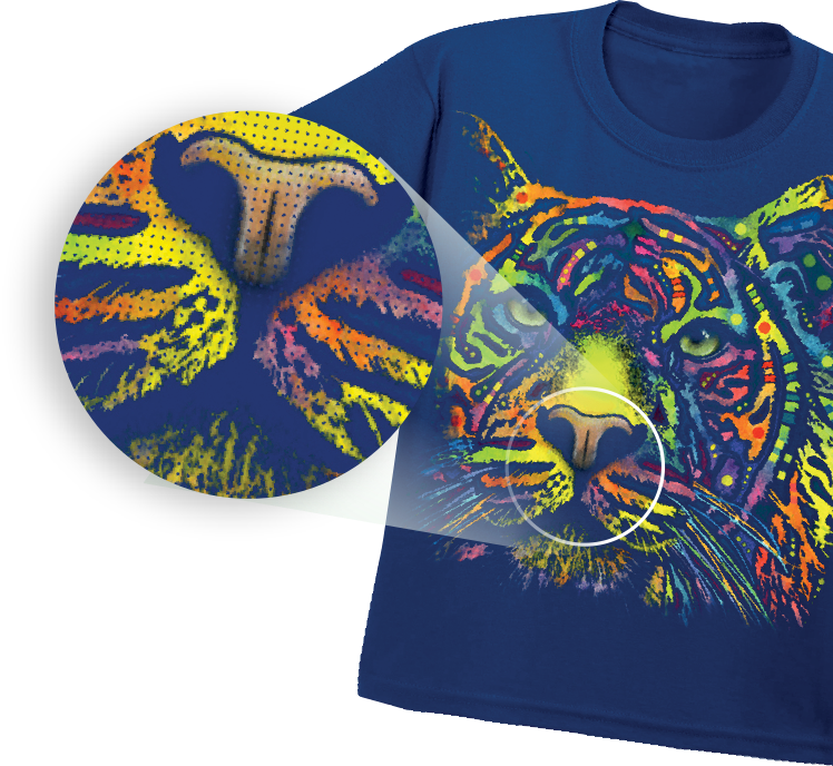 Specialized printmodes without rasters included for select printers are able to simulate a DTG look and feel using DTF technology.